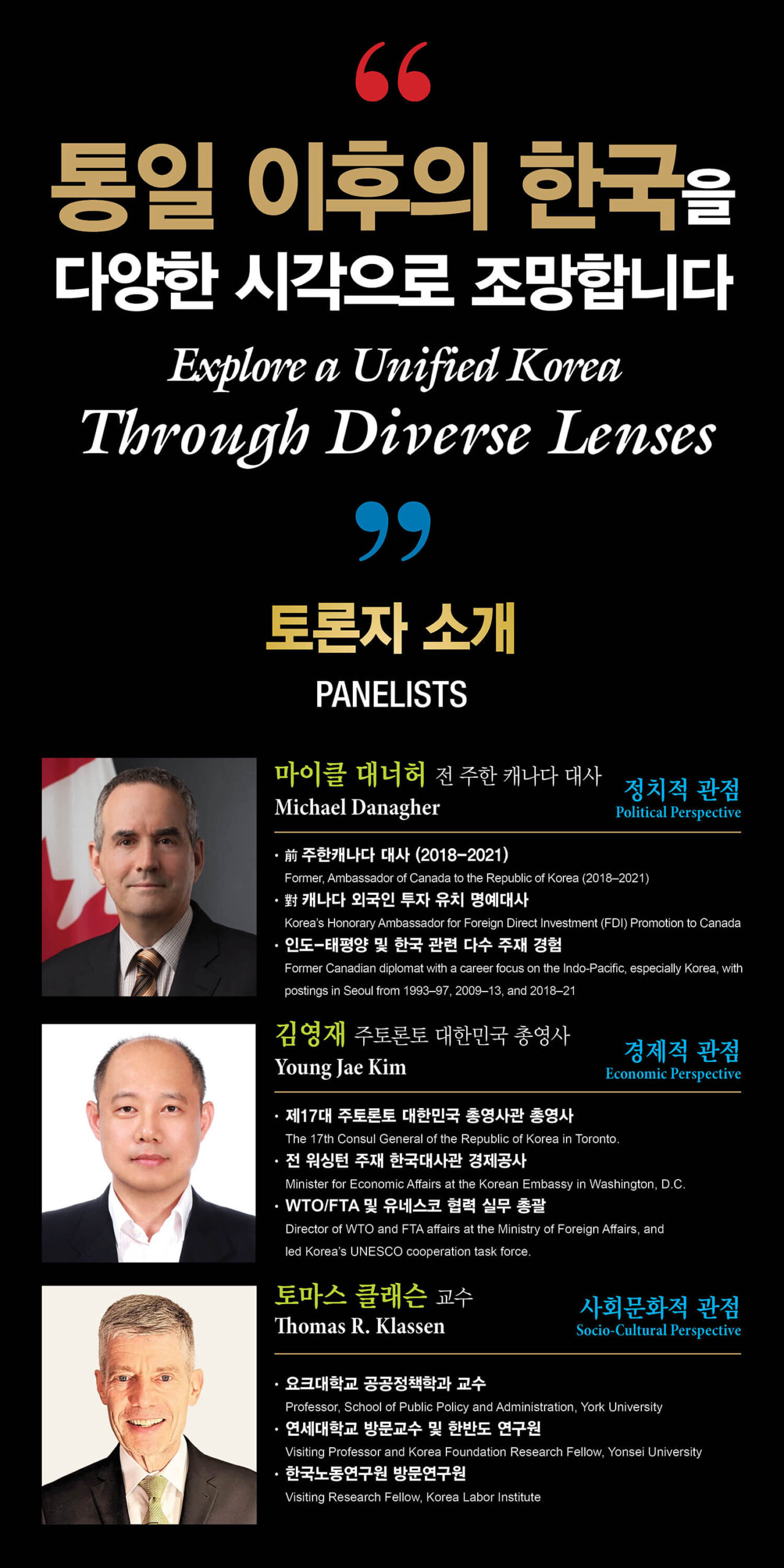 분야별로 ㅇ정치적 관점은 Michael Danagher 전 주한 캐나다 대사가 패널로 나서 ‘통일 이후의 거버넌스 및 국제 관계’라는 주제로 발표한다. ㅇ경제적 관점은 김영재 토론토 한국총영사가 패널로 ‘통일 이후의 산업구조 변화, 통일 비용과 기회’라는 주제발표를 한다. 이어 ㅇ사회문화적 관점은 패널리스트로 Thomas R. Klassen 욕 대학 교수가 주제 ‘통일 이후의 교육, 문화 통합, 남북 주민간의 공존’이라는 발표를 할 계획이다.