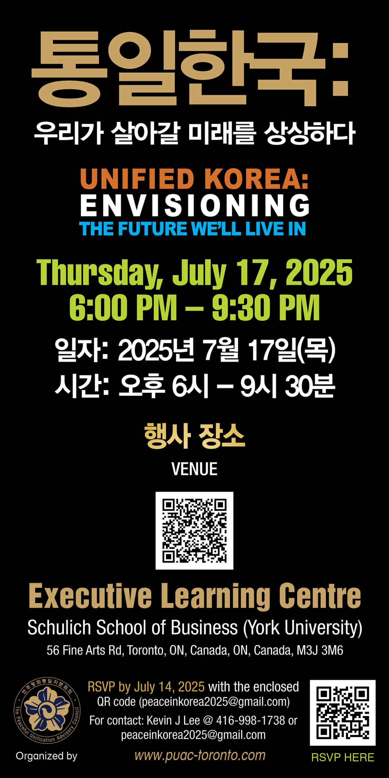 제헌절인 17일 저녁 6시부터 9시30분까지 욕 대학 Executive Learning Centre, Schulich School of Business (56 Fine Arts Rd, 4700 Keele St, Toronto, M3J 1P3)에서 열릴 포럼은 ‘통일한국: 우리가 살아갈 미래를 상상하다’(Unified Korea: Envisioning the Future We’ll Live In)를 대주제로 3개 분야로 나눠 패널리스트 주제발표와 토론을 벌인다.