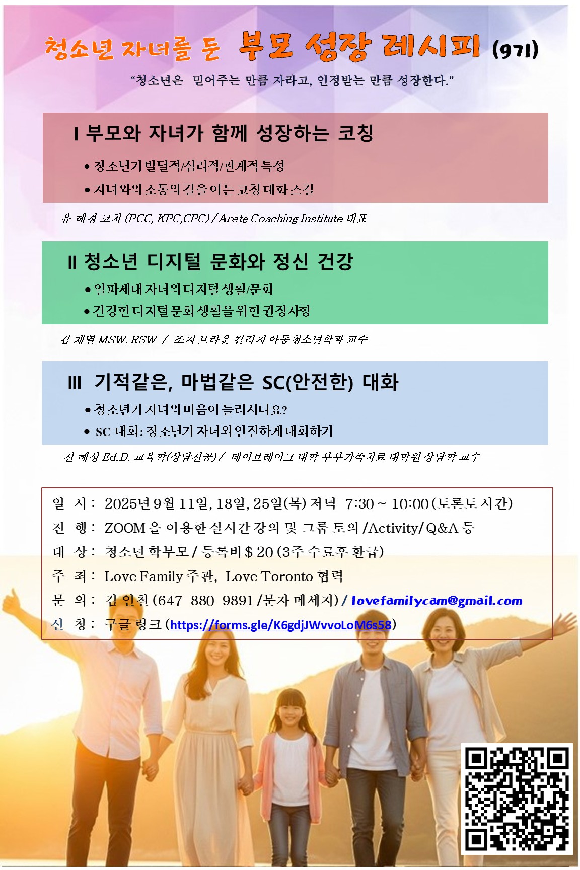 청소년 자녀를 둔 한인 부모들을 위한 특별한 온라인 부모교육 프로그램 Love Family ‘부모 성장 레시피’ 제9기가 오는 **9월 11일(목)**부터 3주간 개최됩니다.