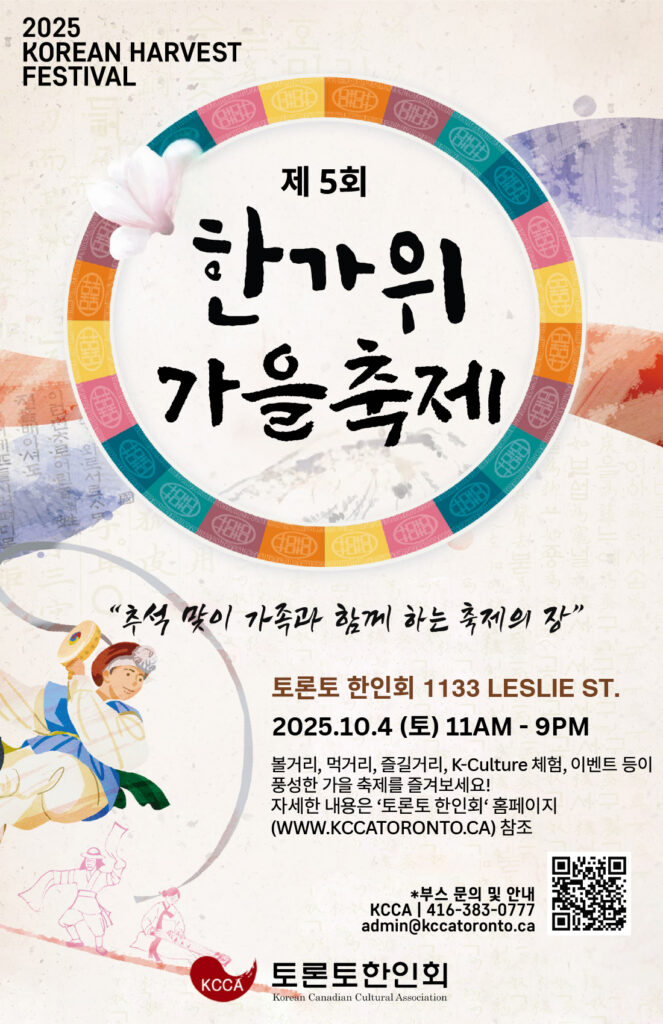 토론토 한인회(회장 김정희)는 오는 10월 4일(토), 토론토 한인회관에서 “2025 제5회 한가위 가을 축제”를 개최한다. 이번 축제는 오전 11시부터 저녁 9시까지 하루 종일 이어지며, 한민족 고유의 명절인 추석(10월 6일)을 기념하여 마련된 특별한 지역 축제다.